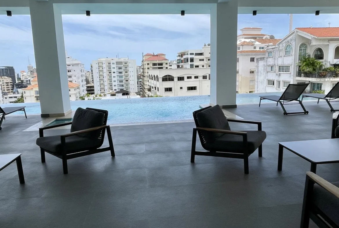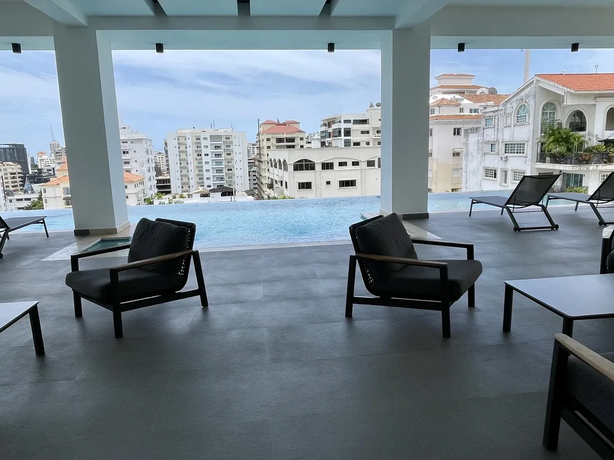 Piscina tipo infinity con vista panorámica, deck para tomar el sol, bar en área terraza. . Gran gimnasio equipado, salón de eventos con mobiliario de primera y bar. Sala de reuniones, área infantil, lockers, sala de choferes. Cuenta con cuatro ascensores (dos de carga). Seguridad con cámaras, planta eléctrica, gas común, parqueo de visitas.