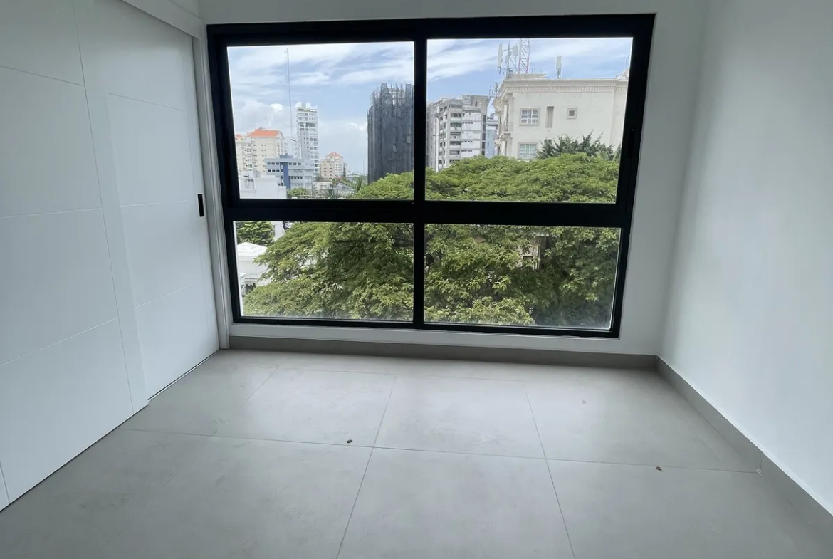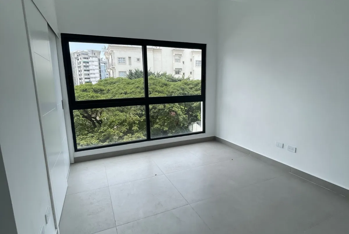 El apartamento, de 143m2 está dotado de iluminación natural. Cuenta con recibidor, sala-comedor, balcón, cocina modular con desayunador, área de lavado y cuarto de servicio. Además, medio baño para visitas y dos habitaciones con sus baños, la principal con vestidor. 2 parqueos.