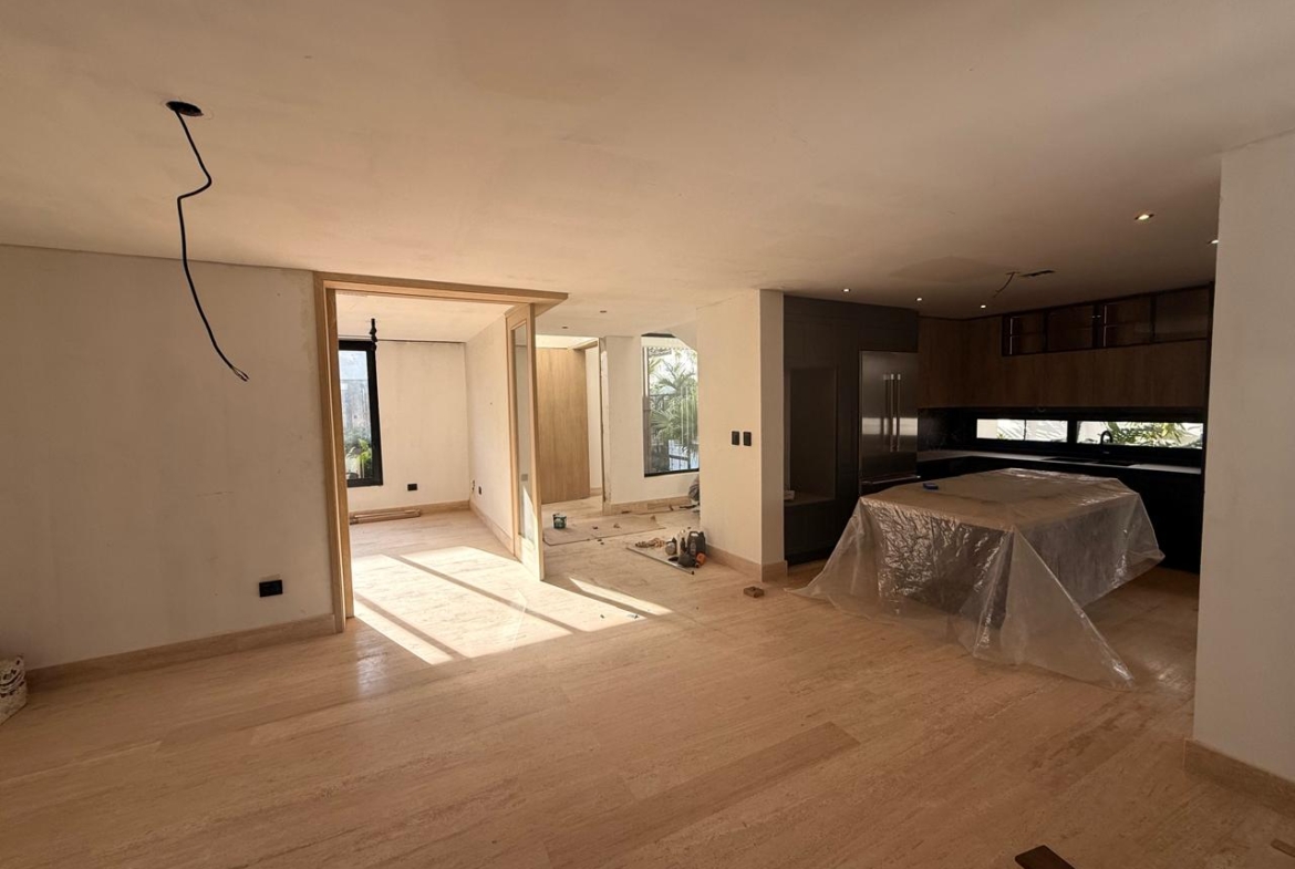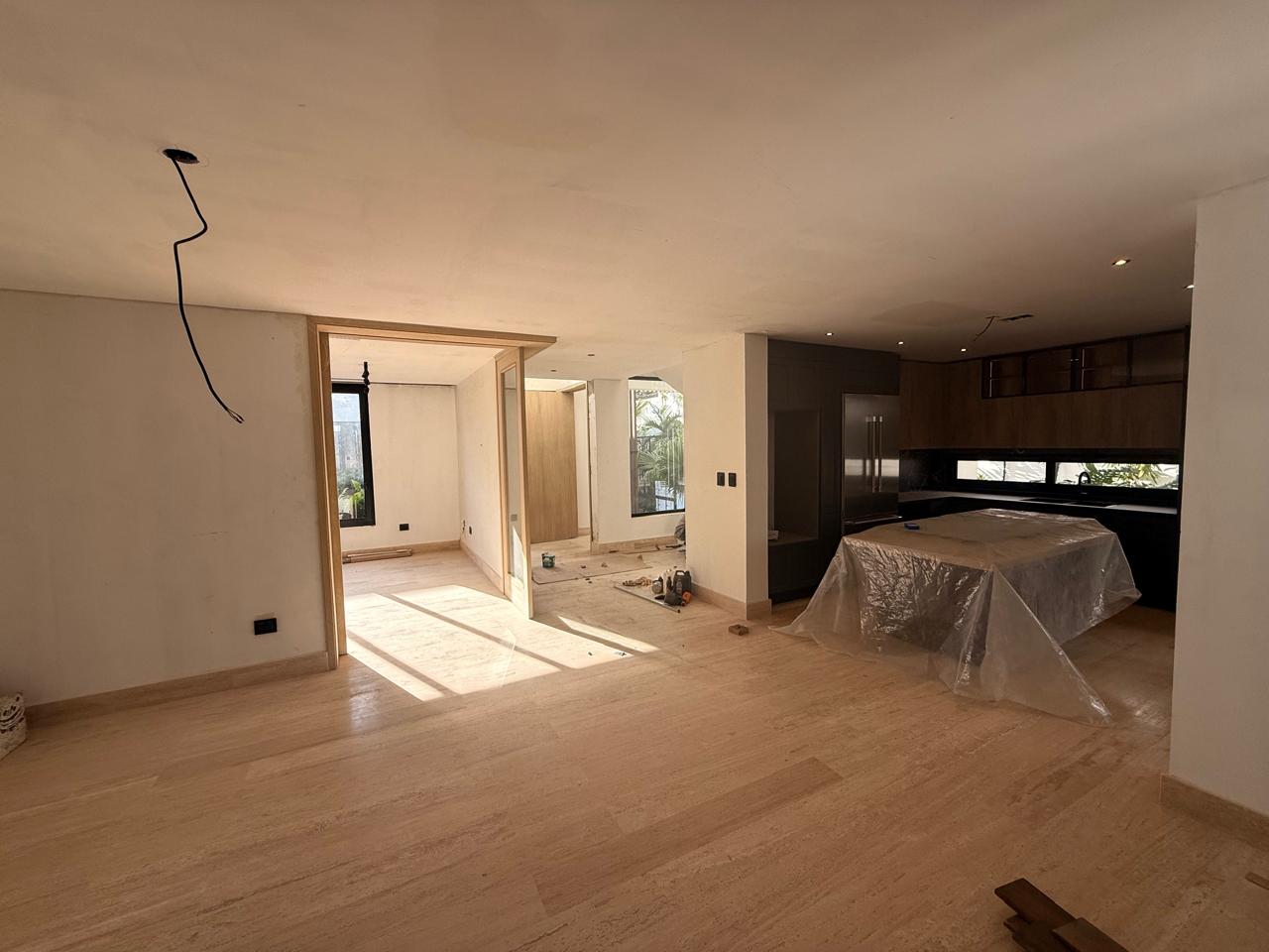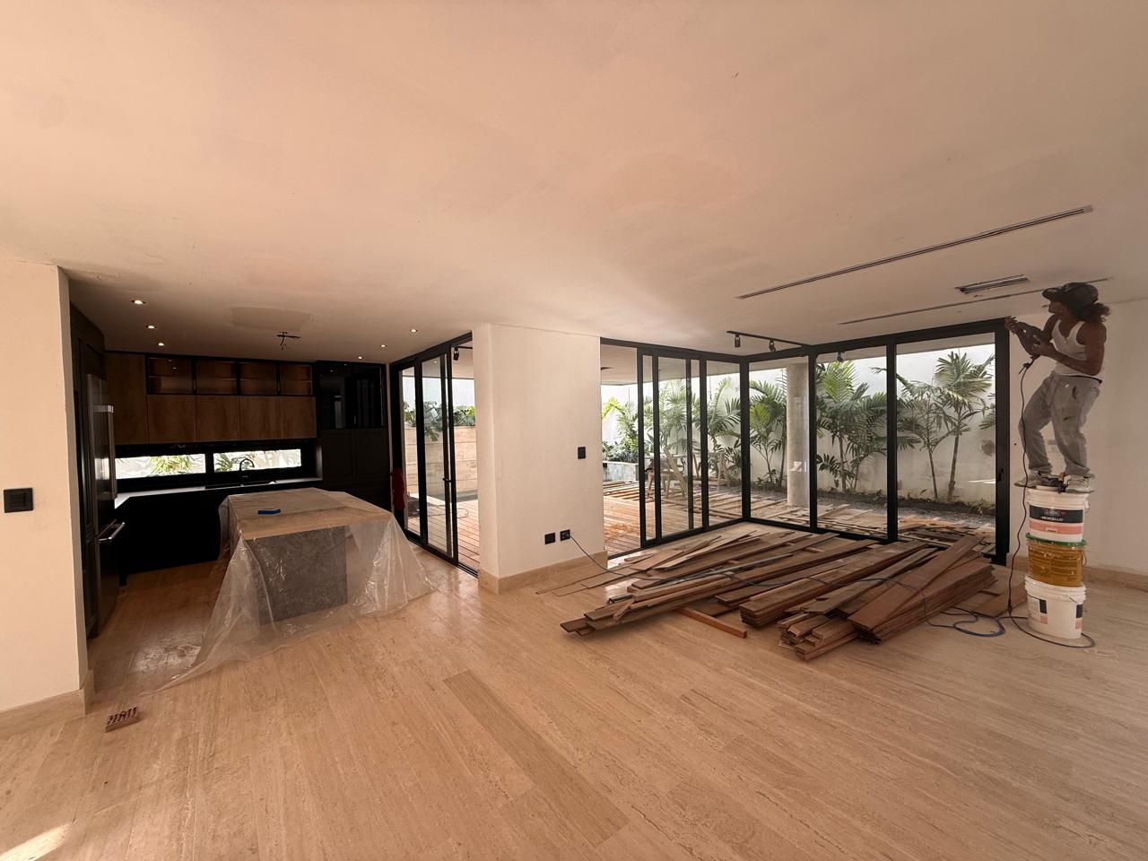 Sala, comedor, estudio cerrado, cocina caliente y fría, terraza techada, habitación de servicio, área de lavado, 4 parqueos,