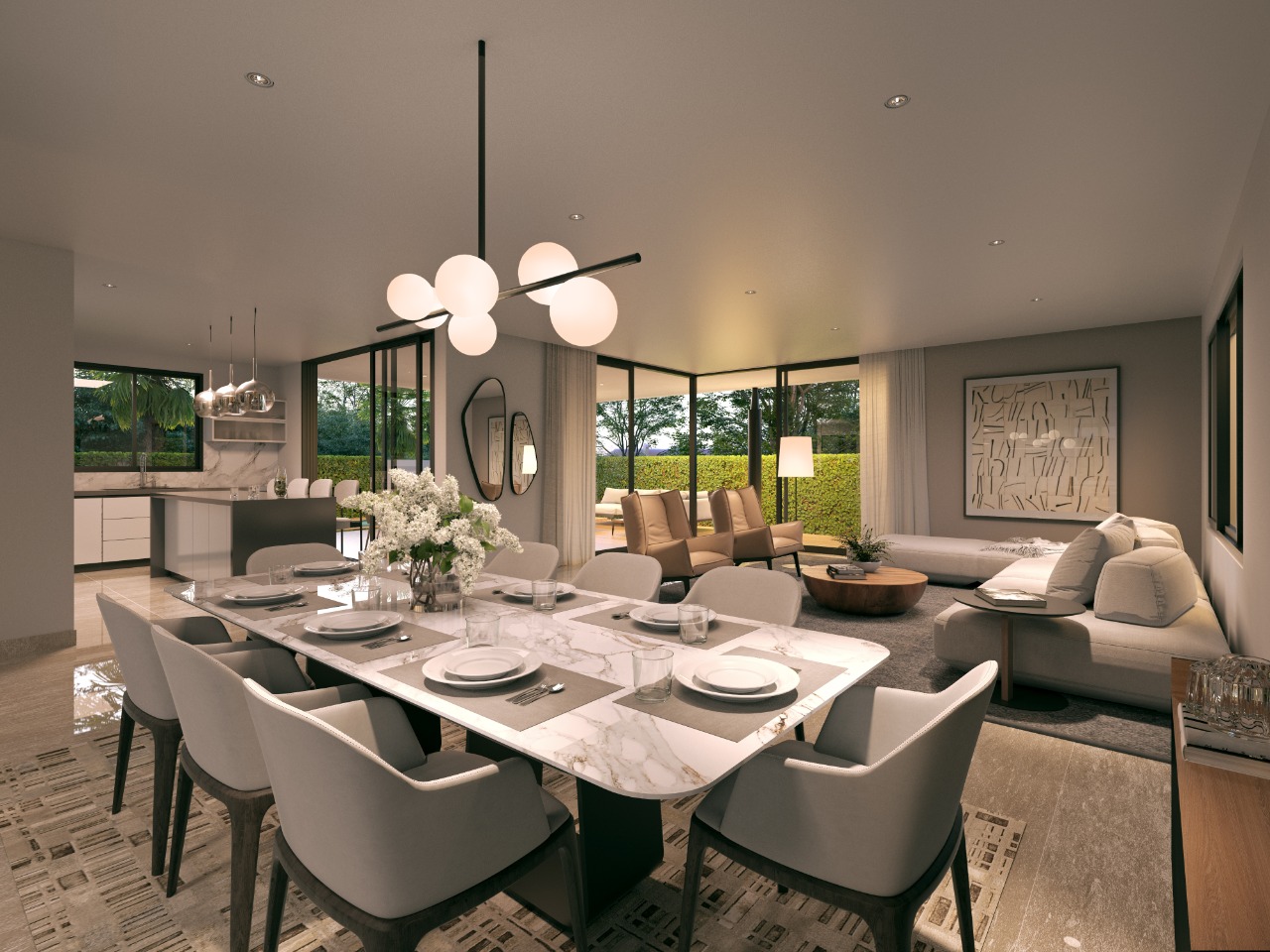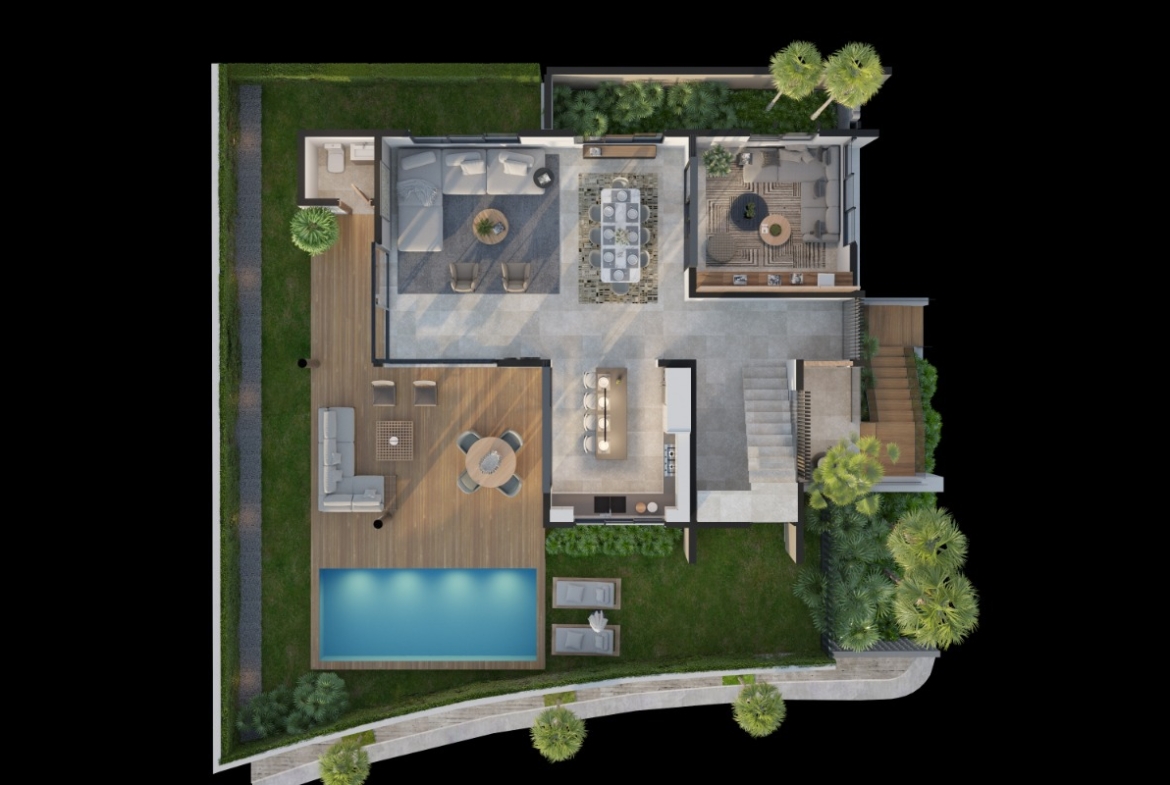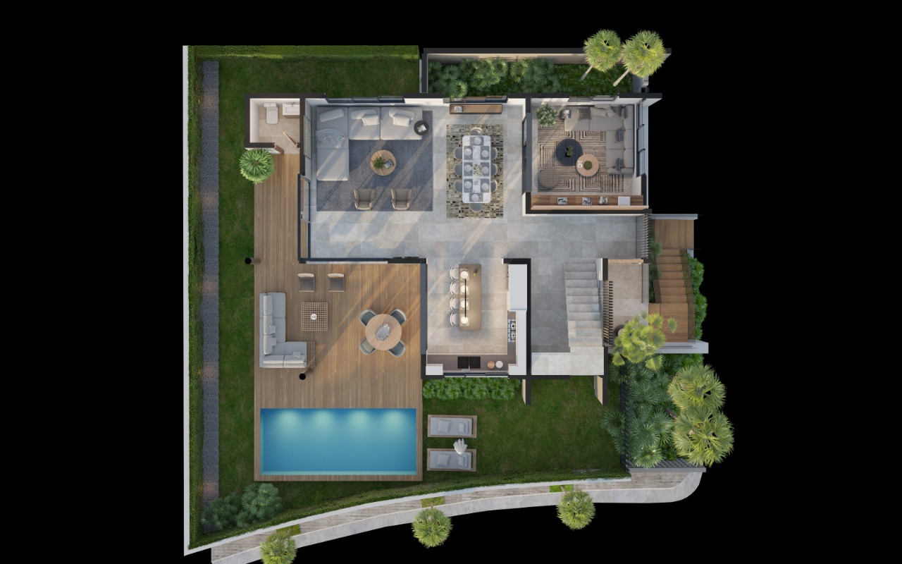Sala, comedor, estudio cerrado, cocina caliente y fría, terraza techada, habitación de servicio, área de lavado, 4 parqueos,